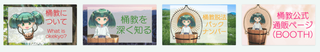 左側にキスメ様を配置することで、桶教のコンテンツへのリンクであることを示すとともに、シンプルな白い背景に文字を乗せることで読みやすさを向上させています。